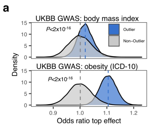 Across each permutation, the absolute effect size for a randomly-chosen outlier sample and matched non-outlier sample was obtained for each gene and summed in a contingency matrix to quantify the number of genes where the outlier variant had an absolute effect size greater than the non-outlier variant (blue shading). This process was repeated for randomly selected non-outlier variants only (gray).